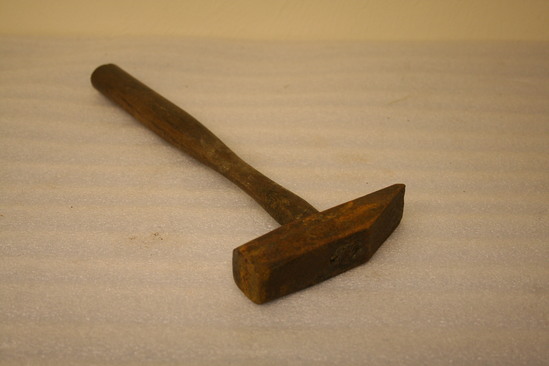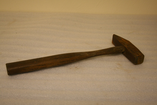 Hammer - iron head. Blocky shaped with defined edges. Long wooden handle. Thinner near head, widening towards end. Wood pushes through hole in center of head. Two iron staples at top of handle.