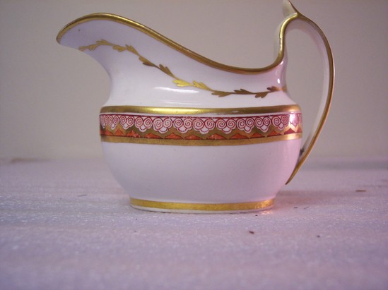 Cream pitcher has a gilt vine motif around the spout and is decorated with gold bands, gold lines on handle, a band with a gold border and red leaf and scroll. Asian inspired design. This is the wedding tea set of Anna Pierce Brace, (Mrs. Charles Loring, married May 6, 1818). Wedgwood #714, "Bittersweet." It was inherited from Mrs. Pennypacher's mother, Mrs. Ruth Loring Whitman; and by her from Mary Hopkins Loring; and by her from Anna Pierce Brace Loring.