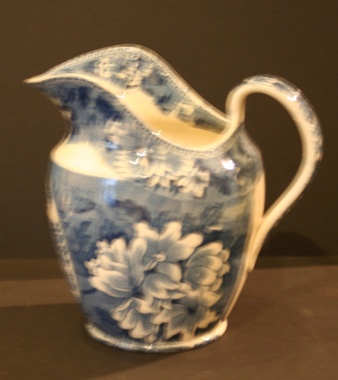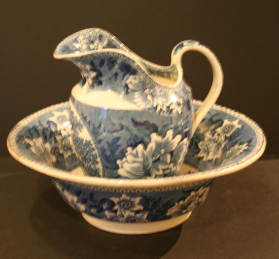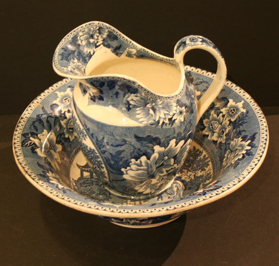 Pitcher and basin in blue transfer-printed pattern of large floral pattern, Oriental scene, man with elephant.