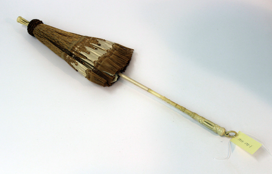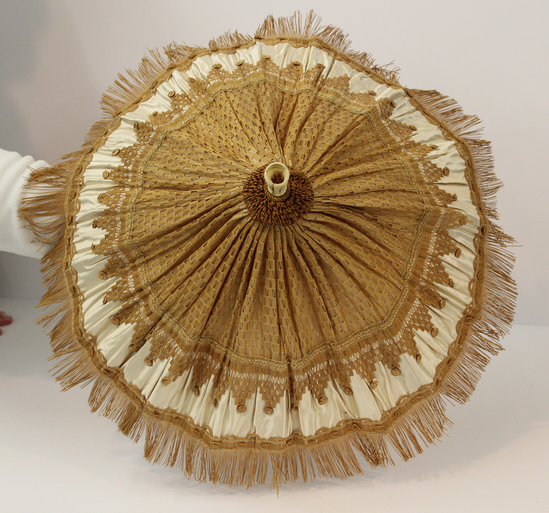 Parasol; ivory satin with applied woven straw; long straw fringe and straw pompom at base of ferrule; ferrule of carved ivory; wooden tube; silk lining; carved ivory handle with moveable loop at base