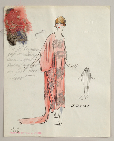 Lithograph and watercolor on paper fashion design. Mandarin gauze tea gown. Silver spangled embroidery on a rose background. Fabric samples accompany the rendering.