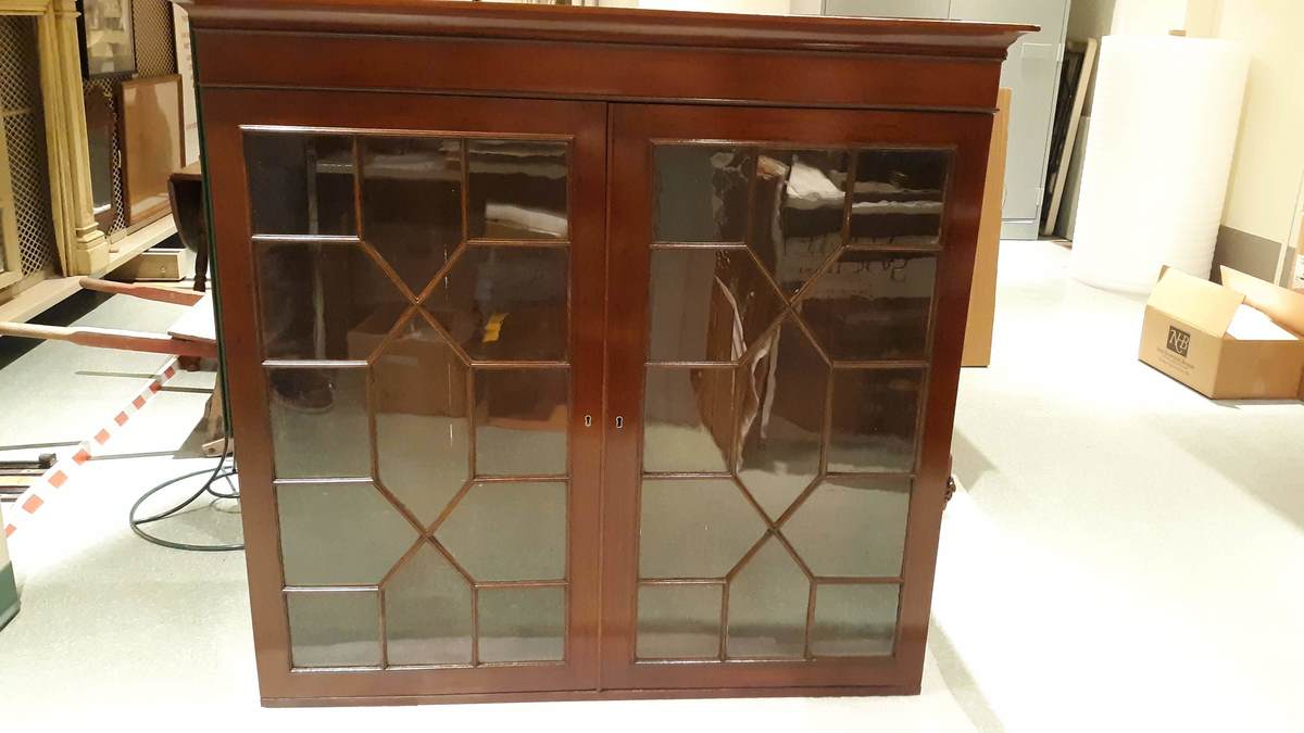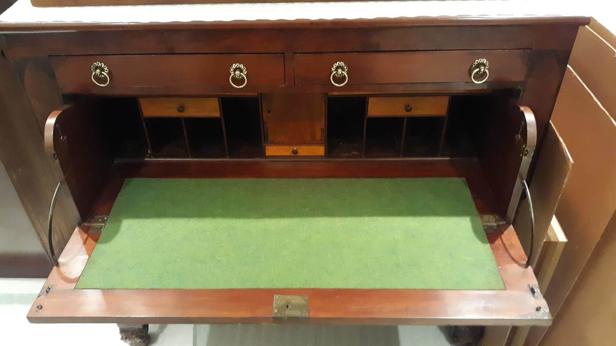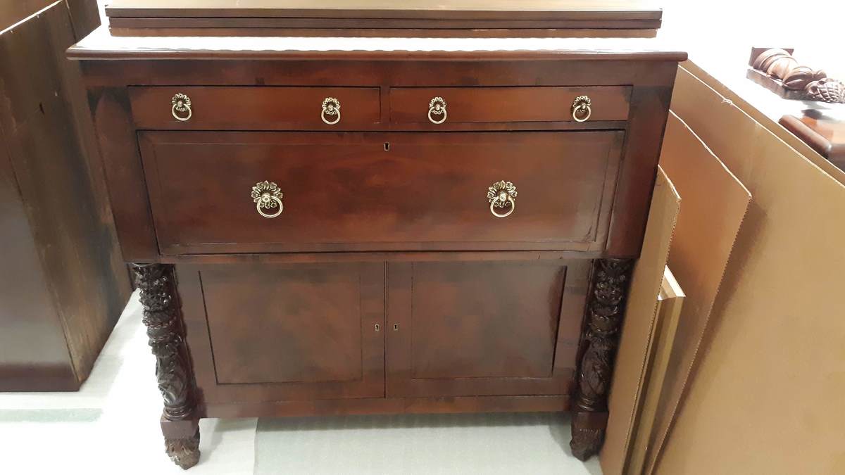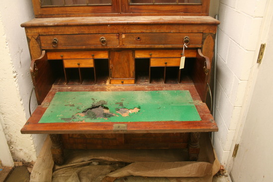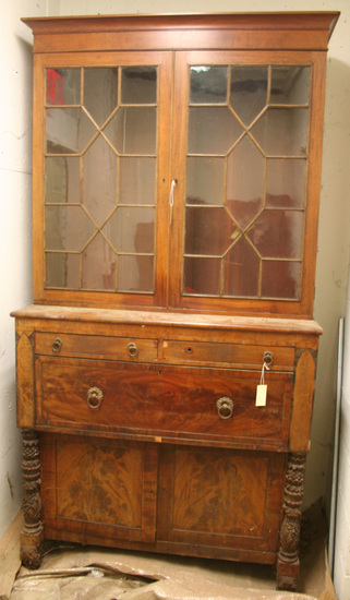 Large desk and bookcase in two parts. According to both appraisals in the file, the top is an earlier piece than the bottom, though it is unclear when the two pieces were married. The lower desk section is in a late federal style. The front has two slender drawers above the drop front. They are veneered in mahogany. The front is flanked by deeply carved and stacked pineapple, sunflower, and acanthus motifs. The columns end in a simple ring-shaped plinth. The front feet are carved scrolled acanthus flourishes secured by interior screws to the frame. Above the carved columns are veneered panels in the shape of a gothic window. The upper section is earlier with glazed geometric mullions in the Georgian manner.