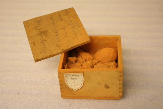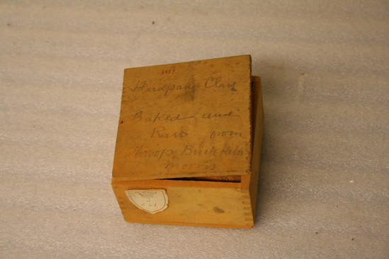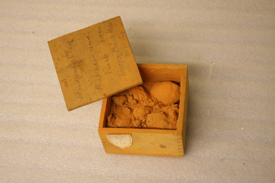 Wooden box with lid. Lid attached to box with one nail which allows lid to rotate open. Box filled with red brick dust.