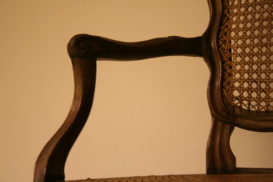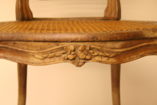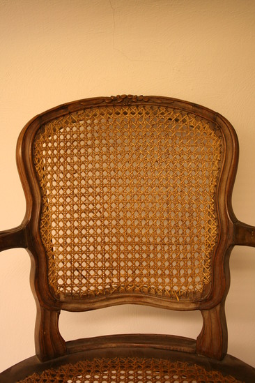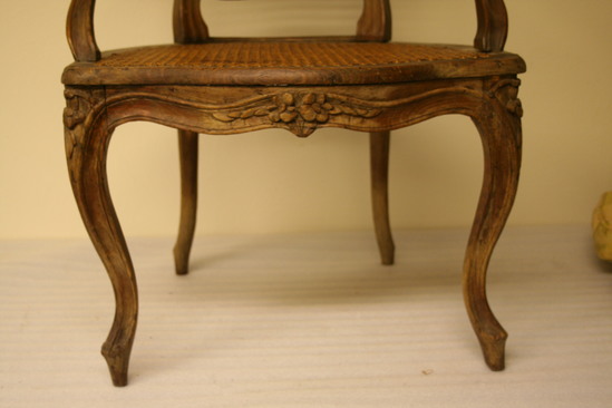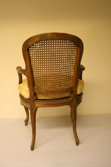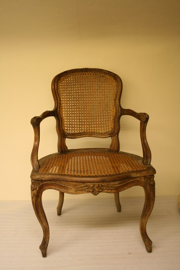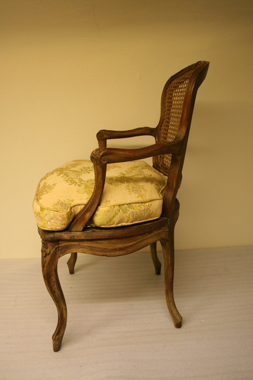 Pair of chairs in Louis XV style - curved legs, shaped back, shaped seat with carded decoration; seat and back are caned; arms curved; overstuffed cushion in floral silk fabric for seat of each chair
