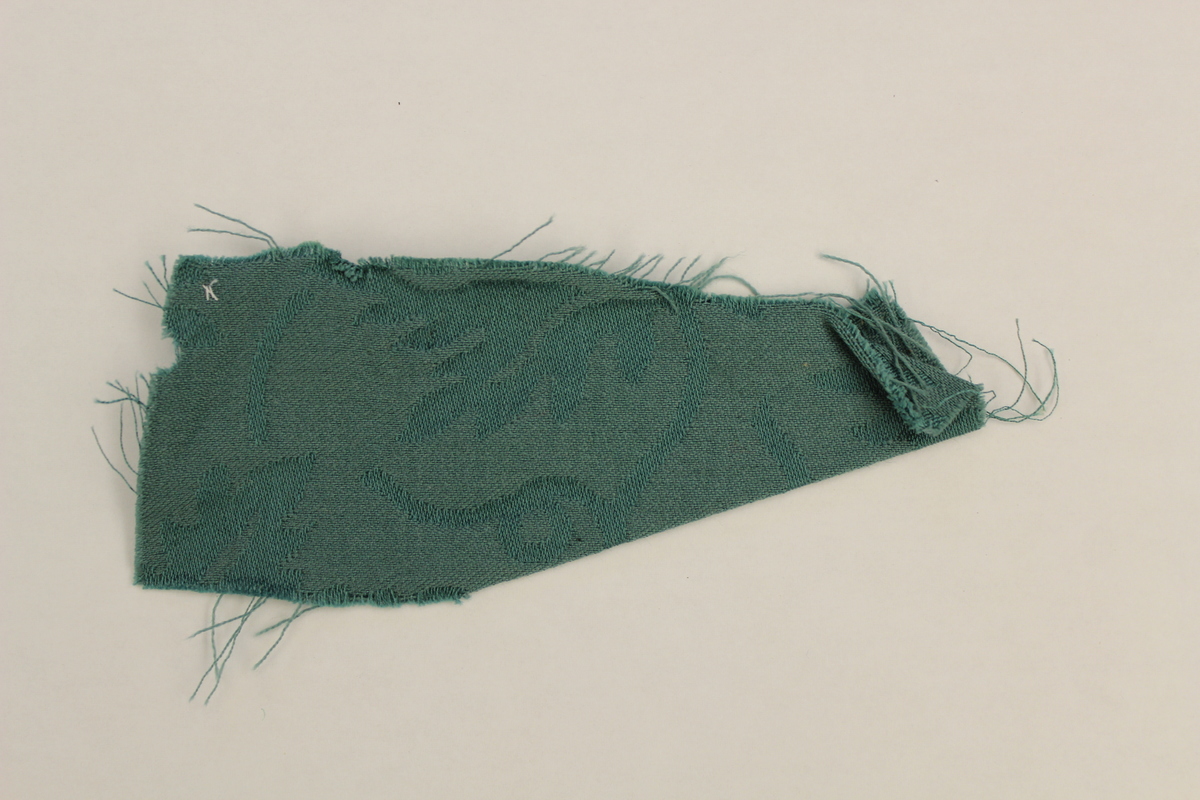 Rectangular fabric swatch made of wool. Fabric is blue -green with a slightly sunken damask print. Print has slight sheen to it. Fabric is rough to the touch. Swatch description is "Hambledon wool damask, oriental blue."