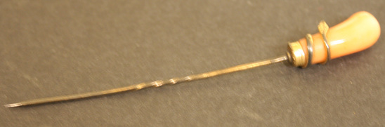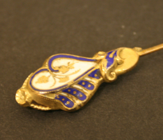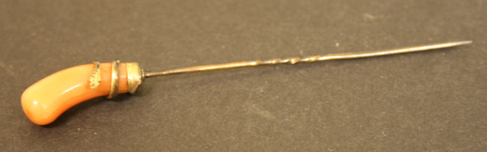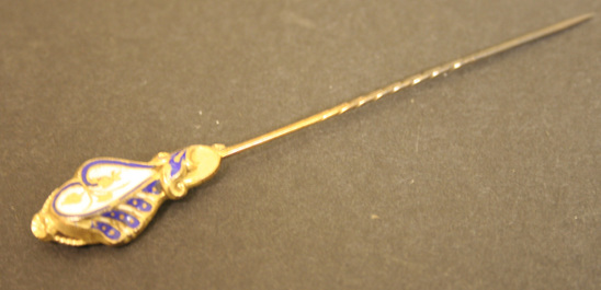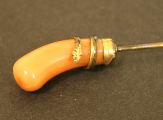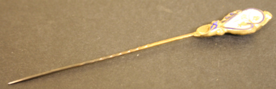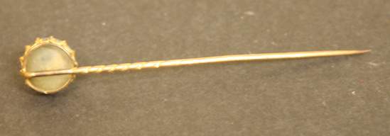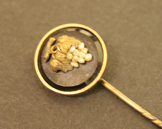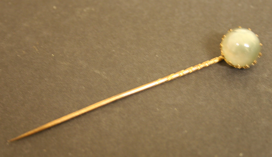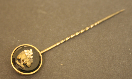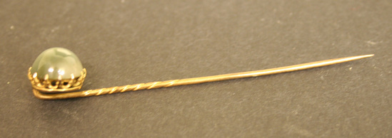 A - Stick pin with large cat's eye. Measures 2 3/4" long, twist towards top of shank of pin, print setting for stone cabacon. B- Coral topped stick pin wrapped at the base with a gold snake and on a twisted gold shaft C-Stick pin with blue and white enamel set in gold feather-like motif on gold metal shaft D- Stick pin with circle of black polished stone with applied cluster of grapes in metal and pearls with fine gold frame; twisted gold shaft