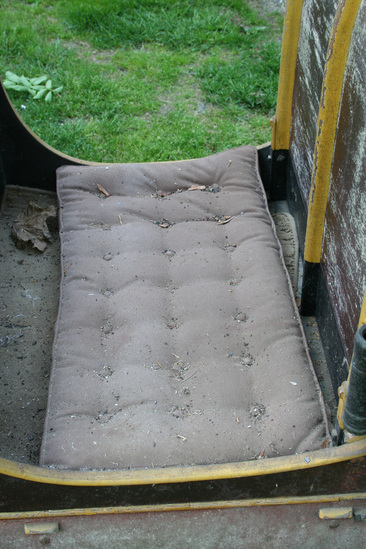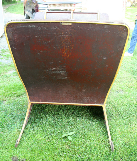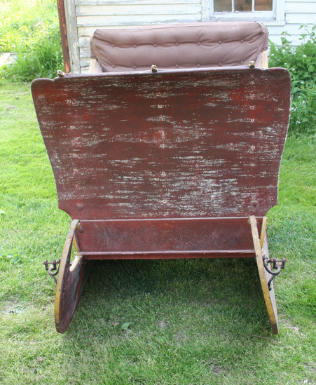 A - Two seat horse drawn sleigh with wood runners edged with iron, body of sled painted red with yellow striping and decoration. Wood has been lacquered. Dashboard is curved forward at top and braced by three staves terminated in eagles heads at top of dash. There is a holder on one side for a whip. Seat is reupholstered with a brown canvas and carpet mat is on the floor. B - Shafts - Wood, painted red with yellow striping, bells attached to underside of shaft.