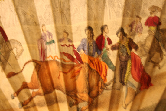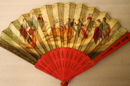 Red ivory stretchers holding paper fan. Paper is painted on both sides. One side shows scene of bull fight while other side shows musician and girls dancing.