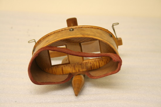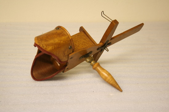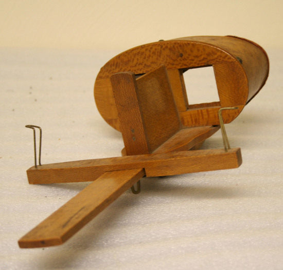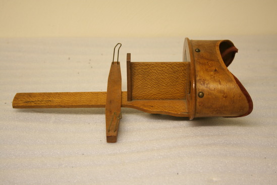 Fitted hood over eyes and nose with red velvet liner. Made of curly maple with six brass dome headed nails. Thick maple front with two square glass lenses. Perpendicular divider standing up right from runner with sliding cross piece having two brass wire card holders at ends bent outward. On base of runner is brass plated swivel attachment with turned pointed hand holder. Two screws hold the shaped runner plate to face unit. Stamped on handle "Patented/July 24/1889"