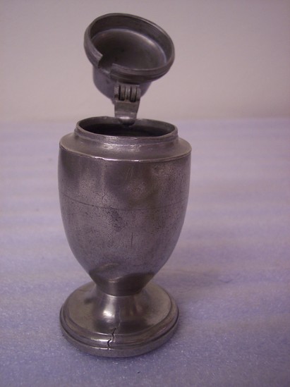Round step base, vase strapped body. Stepped dome lid with tiny acorn finial hinged to handle. Hinged lid with hole for spoon. S-Shaped handle, flat.