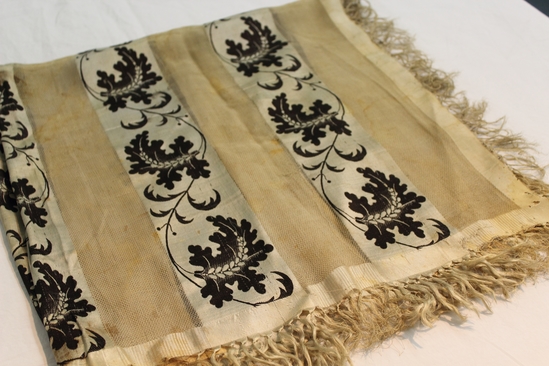 Scarf - alternating strips of white net and black damask with cream leaf design; white silk border around scarf with white silk fringe