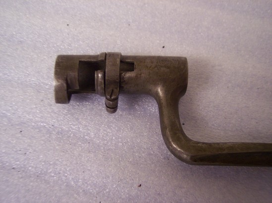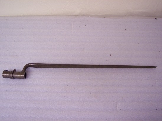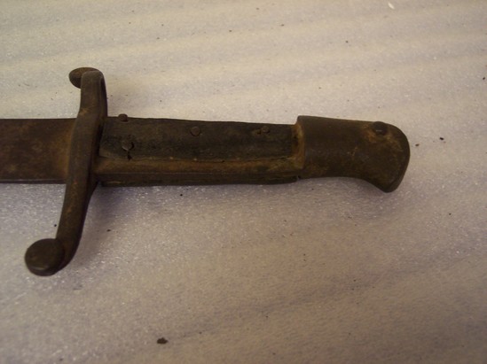 A: rifle wood with metal barrel, hammer, trigger and screws. Has two metal ovals that hang off bottom of rifle where a strap can be worn through. B: Bayonet, metal, fits over top of barrel of gun; long steel blade that comes to a point; base of blade has circular tube that fits over barrel of gun; "US" incised on bottom of inside of blade C: Sword - small handled sword, metal with leather grip. Slight embellishment around handle of blade.