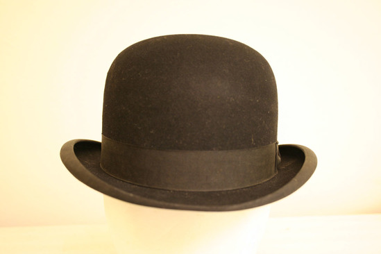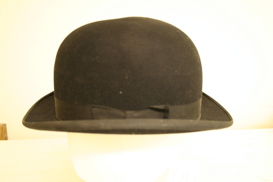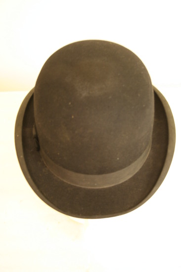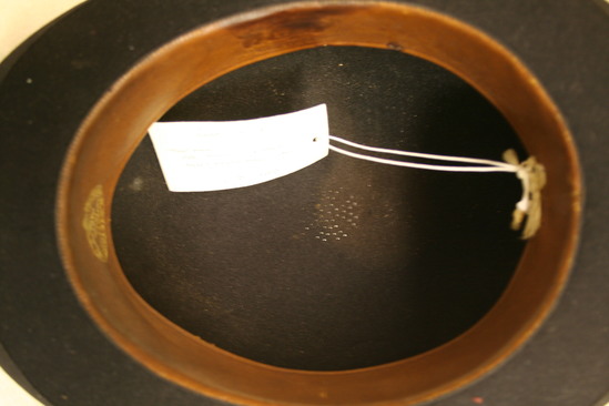 Man's black wool bowler hat; body of hat is round; brim extends around full diameter of hat; brim slightly turned up at sides and edged with a black grosgrain ribbon; black grosgrain ribbon also encircles the base of the hat; tied in a box on oen side of hat; small cluster of holes located at top of hat (air or venilation holes); interior of hat wool with leather band located inside of at near brim; label "John B. Stetson Co." with seal of company stamped in gold