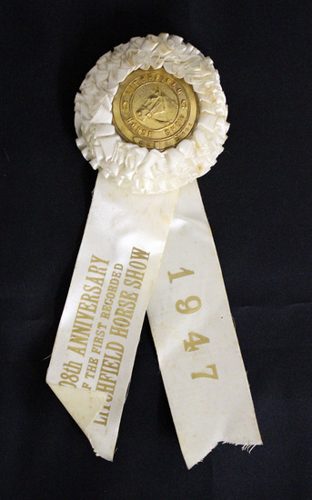 White satin ribbon. Rosette of white satin at top with circular gold medal in center. Medal stamped with an image of a horses head in center. "LITCHFIELD HORSE SHOW" stamped in a circle around head. Two satin tails extend below rosette. One stamped "108th ANNIVERSARY/ OF THE FIRST RECORDED/ LITCHFIELD HORSE SHOW" in gold. The other tail is stamped "1947" in gold.