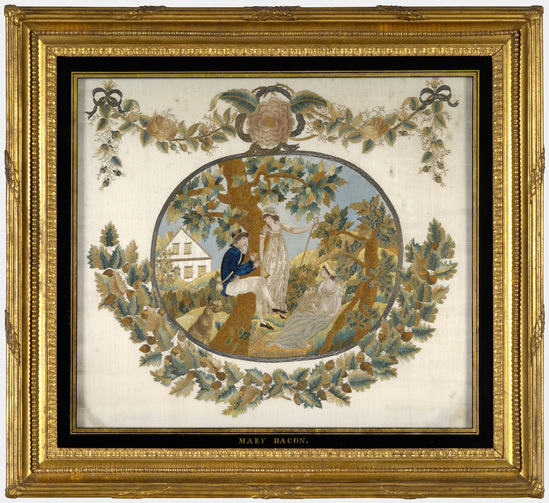 Painted silk needlework pictures worked by Maryann Bacon (Mary Bacon). The silk pictures has a rectangular format with a central medallion depicting a pastoral scene with three figures at leisure in a lush landscape. The young man pictures is playing a small flute while two shepherdesses and their dog look on. The central medallion is bordered with a silver metallic framework of laid and couched yarns. At the top of the cartouche, a large embroidered silk blossom is surrounded by a bow of the same silver yarns. The remainder of the picture is decorated with silk embroidered swags of flowers above and with a half-garland of acorn-laden oak branches below. The embroidered cross-hatched acorn caps are an indication of Mary's skill with the needle. The picture is bordered on four sides by linen tacking edges to which it is hand stitched. These were probably originally used to lace the picture into an embroiderer's frame while it was worked. The linen strips are currently stretched over a wooden strained and tacked along the side edges with large headed iron tacks. The picture is framed behind its original glazing which is an eglomise mat with gilded inscription. The rectangular mat is edged with two gold lines. The bottom of the mat is inscribed in upper case gold lettering with the artist's name: "MARY BACON". The frame is a wooden deep cove molding with gesso and gilded finish. The inner liner is decorated with a lamb's tongue design and a twist fills the cove. The outer rail is decorated with leaves draped over the edge.