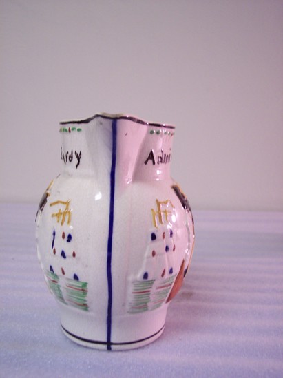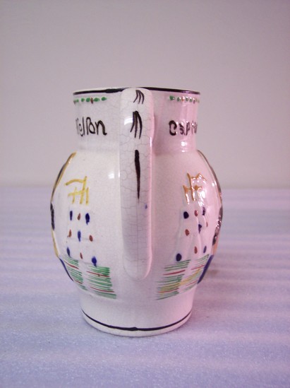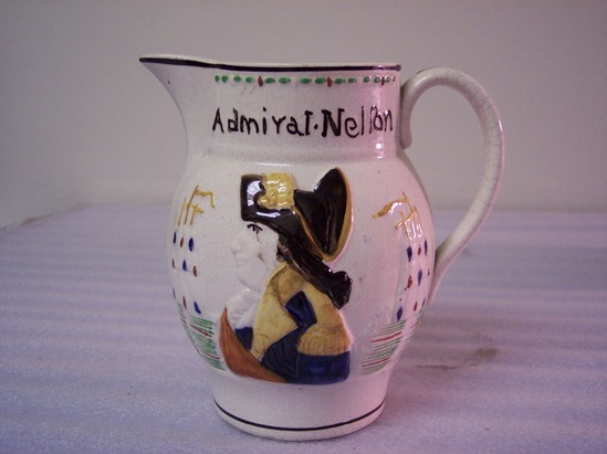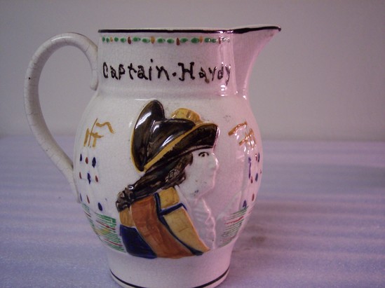 White pitcher with colored reliefs of Captain Haydy on one side and Admiral Nelson on the other. Both figures are labeled. Printed label inside pitcher states, "Pitcher. Maker unknown. Staffordshire, 1800-1850."