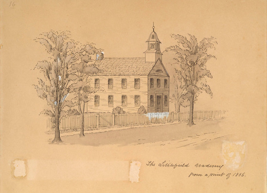 Written on the front in ink "The Litchfield Academy from a print of 1856." On the back in ink "The Litchfield Academy/North St/from an engraving of 1857." Initials E.N.V. 1896 on left under fence. Label attached with scotch tape and removed "The so-called 'Second Academy' built in 1827 on North Street next to Miss Sally Pierce's house for her school."