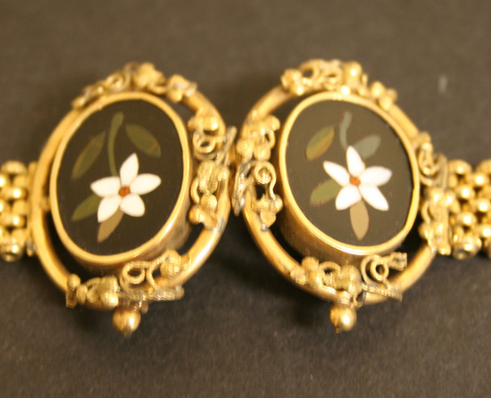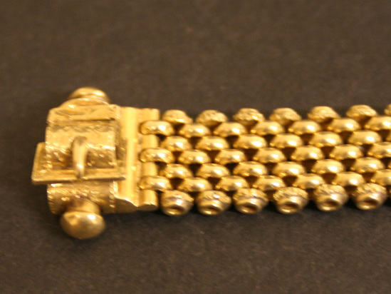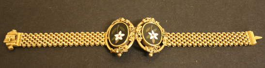 Center of bracelet has two oval black stones set in gold collar and loop with tendrils of gold holding them together. Each black stone has a flower in center made of white, green and red inlay. The body of the bracelet is made of a series of small gold loops strung together. The clasp is locked by inserting one end into the other. Round knobs at top and bottom of clasp release lock.