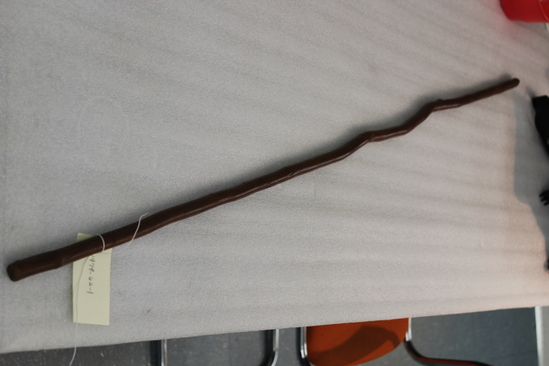 Walking stick of naturally curved wood that has a dark brown finish, no handle, no tip