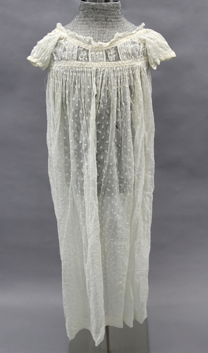 White patterned cotton child's dress; embroidery; lace insertions on bodice; dress gathered at waistline and neckline; lace trim around neckline; buttons on sleeve cuffs; short sleeves; tie closures at center back