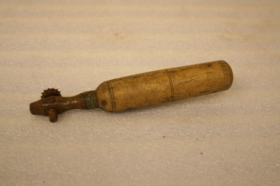Cobbler's tool. Wooden handle, round with incised lines at top, middle and end. Brass ring at top of handle with piece of iron protruding from brass. Perpendicular to iron is an iron wheel with jagged spikes. Wheel rotates.