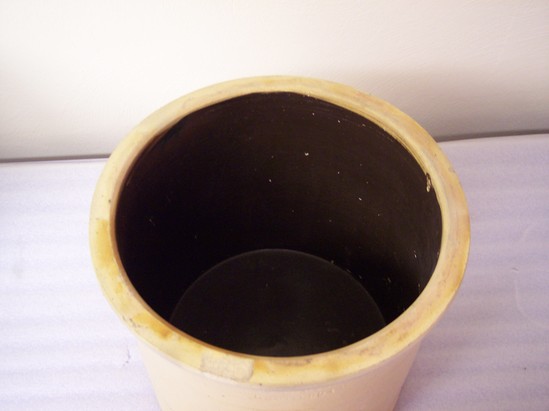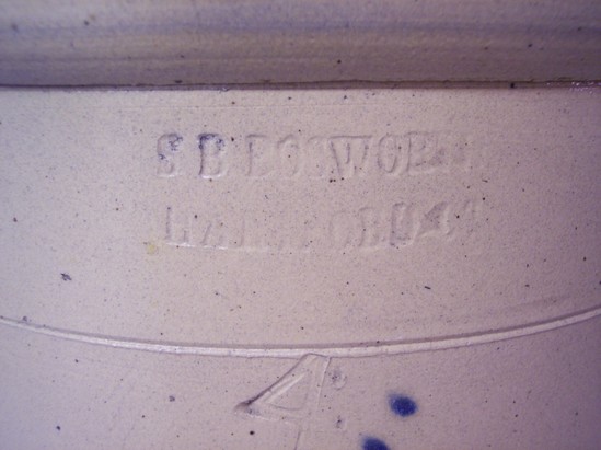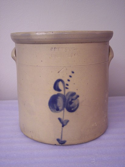 Salt glazed, with stylized plant design in blue slip. Dark interior. Thick rim with lug handles. Straight sides.
