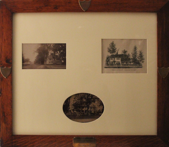 Wood picture frame made from wood taken from four historic houses in Litchfield, CT - the Horton House, Marsh House, Wolcott House, and Tallmadge House. A rectangular brass plaque attached to the front, bottom portion of frame, engraved "FRAMED IN WOOD FROM/ FOUR HISTORIC HOUSES/ TALLMADGE." Shield shaped brass plaque attached to top, engraved "HORTON". Shield shaped brass plaque on right, engrave "WOLCOTT". Three photos framed under glass in frame with off-white mat. Photos are of the Marsh, Wolcott, and Tallmadge houses.
