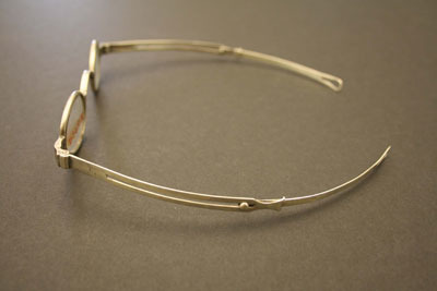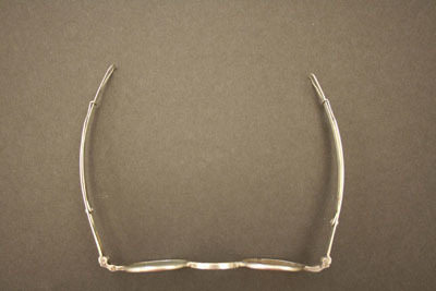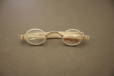 Silver frames, oval lenses with clear glass. "C" shaped bridge; extension bows with tear drop shaped loop at end. "24" stamped on exterior of left bow and "H. Adams" stamped on interior of right bow.