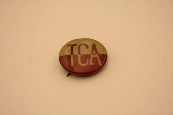 Round button with stick on back. Top half cream colored bottom half red "TCA" in large letters