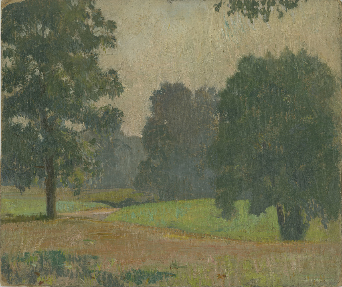 Oil painting on wooden board with dirt path in foreground and winding into the landscape towards the cluster of trees in the background. Landscape is dotted with trees - more nondescript in the background. Purves uses a soft palette - greens, purples, oranges with touches of pinks, whites, yellows and blues. The back of the board is textured and painted white. Written on back in pencil: "Austin Purves/Oyster Bay/1923."