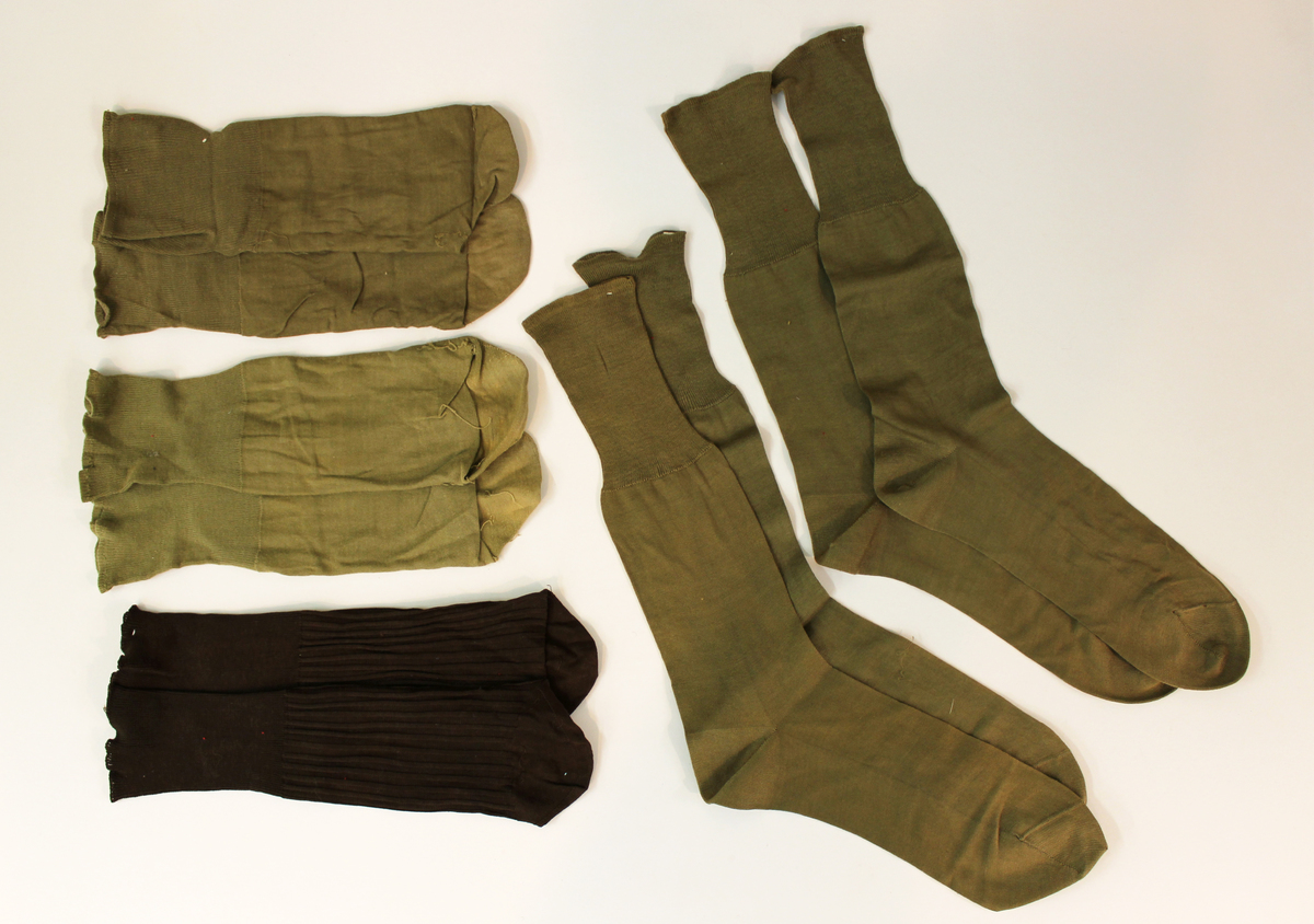 Five pairs of cotton stockings, part of World War II era uniform. A,B: khaki ankle socks, 12.5" length. C,D: khaki ankle socks, 12" length; E,F: Dark khaki knee socks, 20.5" length, orange "12" on toe of one sock. G,H: same as E,F. I,J: dark brown ribbed ankle socks, 12.5" length.