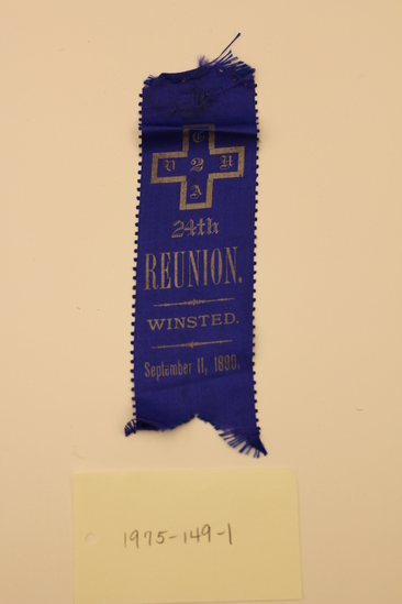 Royal blue G.A.R. ribbon. Silver printing: "(cross with C / V / H / A with a number 2 at center / 24th / REUNION. / WINSTED. / September 11, 1890." Pointed top with inverted V bottom.