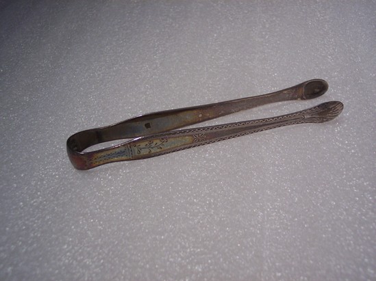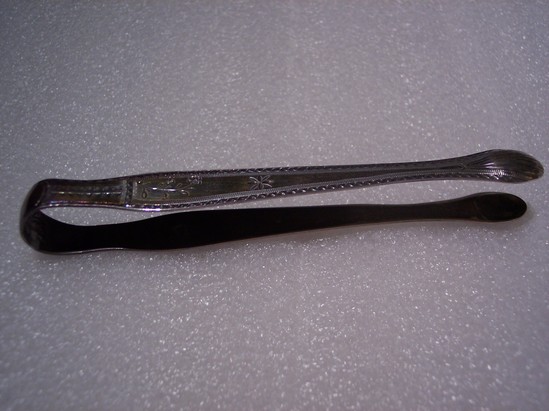 Silver sugar tongs, shell tipped, floral decoration and chip work decoration. "BMT" engraved on arch of tongs. Initials stand for Benjamin and Mary Tallmadge. Hallmark on inside of one arm "GB" and lion touch