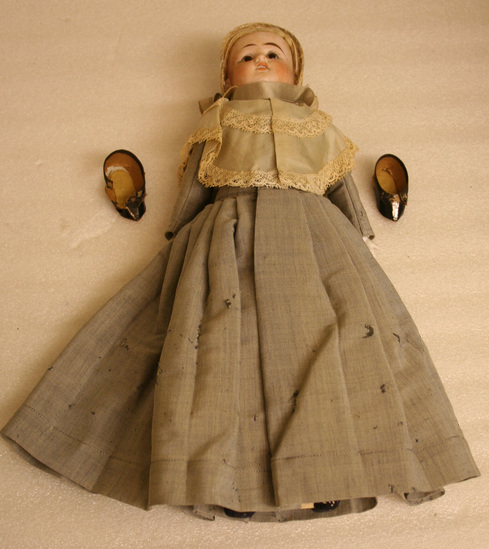 Doll - white kid leather body. Head and hands are bisque. Face of doll is painted and doll has brown eyes and blond hair braided down back. The doll wears a Shaker woven straw bonnet over a net cap. The dress is a gray Shaker made cotton, plain bodice, full skirt pleated around waist. A grey silk cape trimmed with two bands of lace is pinned down front and at waist on front and back. Her underclothing consists of long drawers, a short petticoat, and a long petticoat.