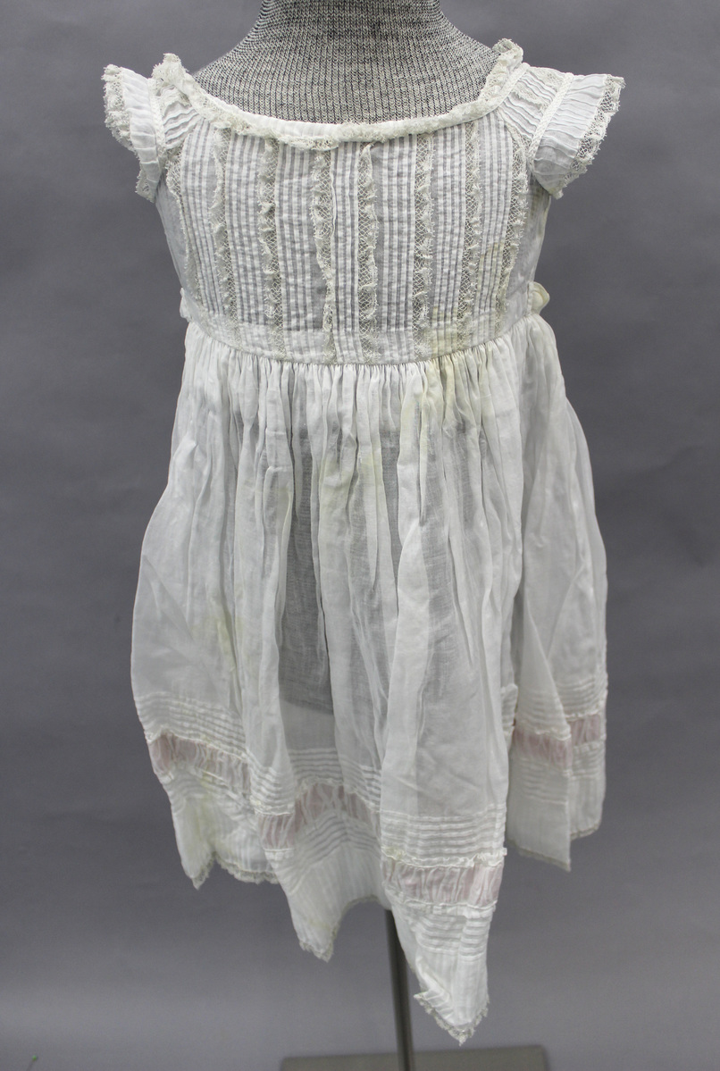 White sheer cotton child's dress; square neckline; sleeveless; bodice with tucks and lace ruffles; skirt with tucks and pink fabric insertion; drawstrings at neck and waist; covered buttons at center back; tie belt with tucks and lace