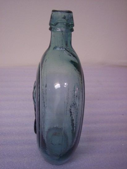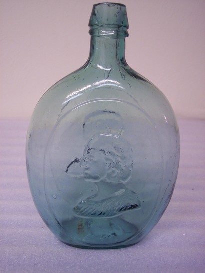 Portrait flask of Washington, classical profile but without queue, facing left, broad band of toga showing. Reverse, Taylor provile bust in uniform, four buttons on coat, facing left. Quart size flask, aquamarine glass.