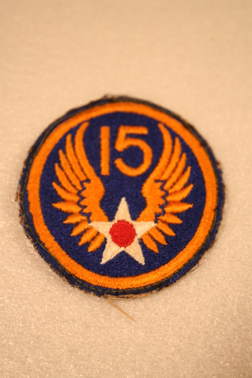 Round patch, blue background, yellow border. In center large "15" in yellow thread underneath white star with red center and large yellow wings extending from sides. Shoulder sleeve insignia of 15th Army Air Force Division, which served in the Euro-African theater during WWII.