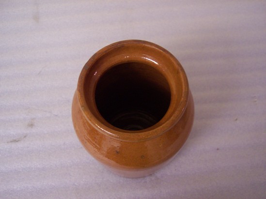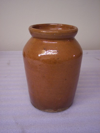 JAR HAS COLLAR-LIKE NECK WITH SLIGHTLY ROOLED RIM, PLAIN BASE. HIGH SHOULDER THAT TAPERS TO BASE. CLEAR GLAZE ON INTERIOR AND EXTERIOR