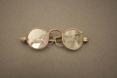 Round lense shape with clear glass. Right lense badly cracked. Double hinge bows. Pronounced "C" shaped bridge. Bows end with large circle shaped loops