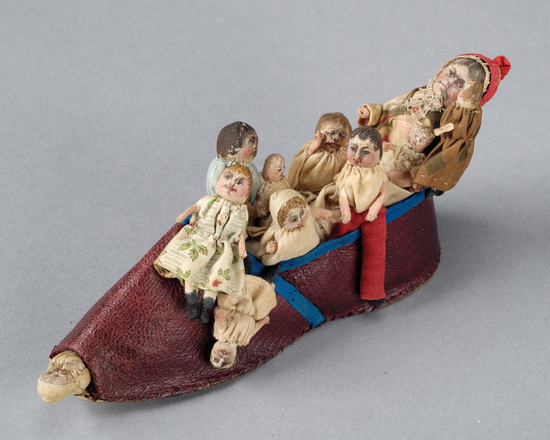 Small hand made red leather shoe with a blue ribbon trim. Shoe is filled with eleven small handmade and painted fabric figures constructed from a thick, stiff fabric depicting the old woman who lived in a shoe. Figures are all dressed in hand-stitched fabric costumes and secured to the shoe and each other with thread to create one unit. Inside of shoe is stuffed with un-dyed wool.