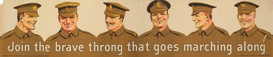 World War I era poster. Log, rectangular. Six soldiers shown from the bust up in uniform. "Join the brave throng that goes marching along" in white letters across bottom of poster.