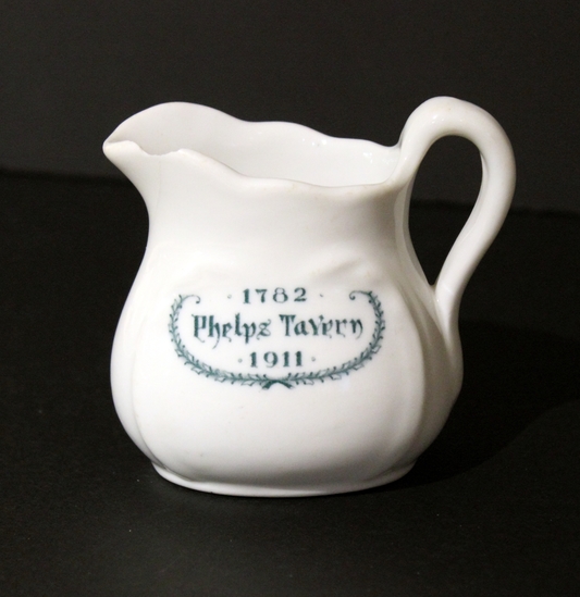 Small white creamer with single-bend handle. Creamer marked with transfer print under glaze in green on one side that reads, "1782/ Phelps Tavern/ 1911." Words surrounded by a green garland.
