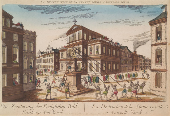 French engraving with hand coloring, entitled at the top, "La Destruction de la Statue Royale a Nouvelle Yorck." Image of a city square with European style architecture. In the center is a tall pediment with a statue of a standing male in the style of a Roman emperor, holding a scepter in his left hand. The statue is being pulled down using ropes, ladders, and pickaxes by a group of men, predominantly enslaved or free Africans (depicted in short pants and turbans) and a small number of white men. Onlookers are gathering to the right of the statue and in nearby windows and balconies. Groups of soldiers can be seen in the distance to the left of the statue. The title is repeated below the print in both German ("Die Zerstorung der Koniglichen Bild Saule zu New Yorck") and French. In smaller text at bottom, "A Paris chez J. Chereau rue St. Jacques au dessus de la Fontaine St. Severin no. 257."