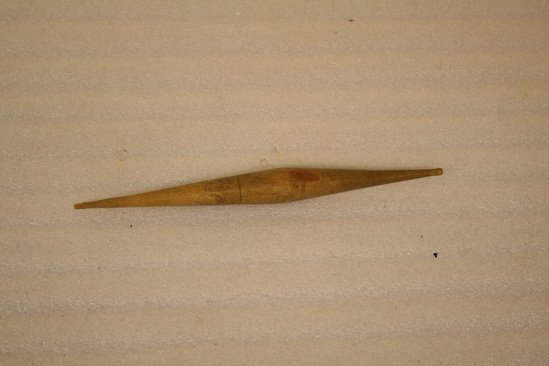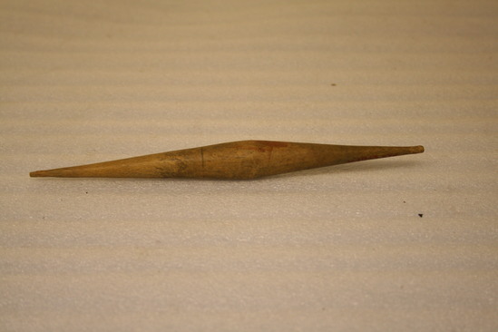 Single piece of wood. Widest in center, tapering to a sharp point on each end. Incised line in center of piece. Possibly used as a scribe to mark wood?