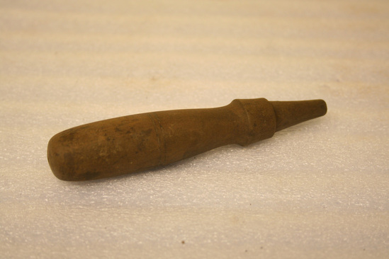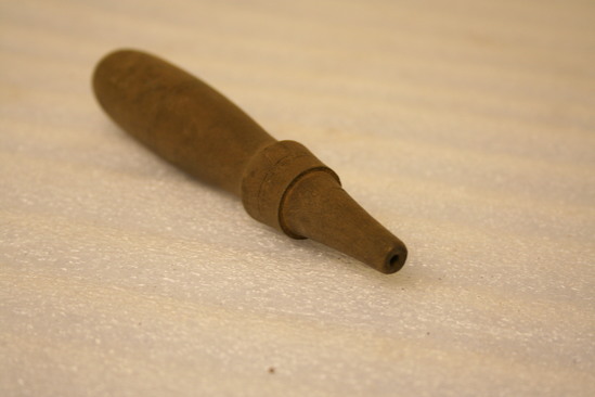 Wooden handle, round, shaped body. Narrows into cone shape at top. Hole where another piece would be inserted