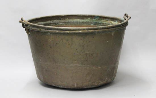 Large brass kettle with copper coated exterior. Large rounded handle hooked on either side.