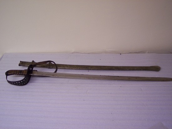 A: Sword, 1 edged blade with wooden handle with brass edge and pierced hand cage. Leather strap tassel attached B: Steel scabbard with two rings and fitted slots for blade guards
