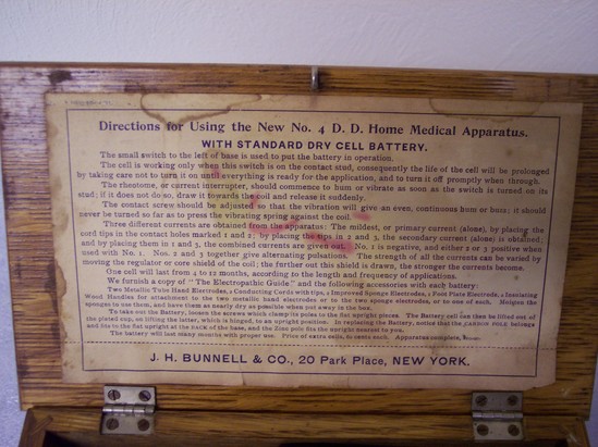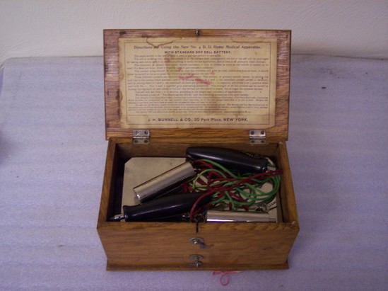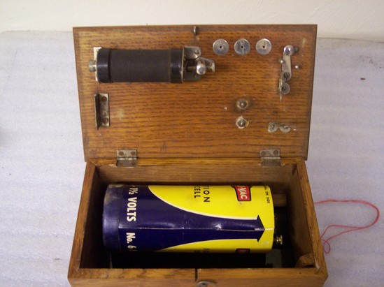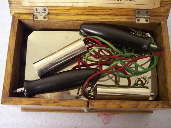 Wooden carrying case with metal handle. Opens from both top and bottom. Closed with metal hooks. Inside is dry cell battery (RAY*O*VAC), 2 metallic tube hand electrodues, 2 conducting cords with tips, red and green, foot plate electrode, 2 black insulating wood handles. Missing are two sponge electrodes and the guide book.