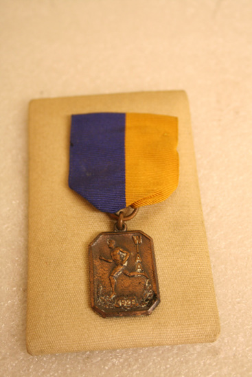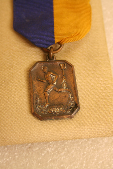 Short ribbon, half yellow, half blue (vertical bands) with pin at top on back, rectangular shaped medal at bottom. Raised image of man running, down right side - one letter under another "W/I/A/A" at bottom fo medal "1925" etched into back of medal "100 Yard Dash"