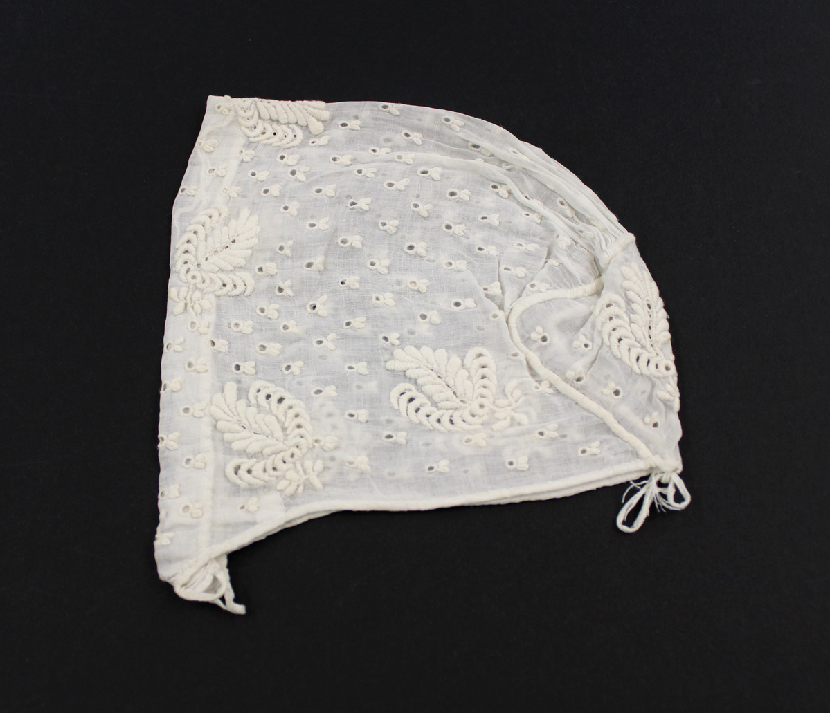 White sheer cotton child's bonnet; dotted and floral embroidery; fan-shaped section at center back; drawstrings at center back; loops at sides